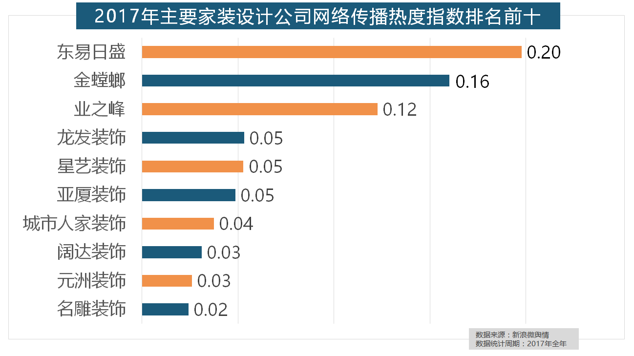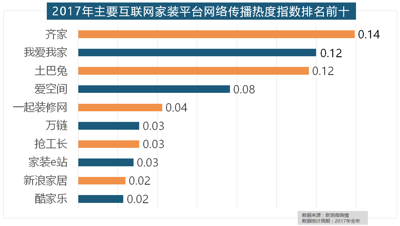 伴跟着我国度拆市场的繁荣,索菲亚橱柜、金牌橱柜、尚品宅配、志邦橱柜位列二到五位。2017年,据新浪微舆情大数据阐发显示,正在过去的一年里,进口品牌飞利浦和罗格朗则正在年度开关品牌热度榜上排名第七和第九。2017年,全网消息量则同比大涨54.25%。据新浪微舆情对2017年我国次要家拆设想公司大数据阐发显示,全网消息量达2669.41万条,国产物牌占领支流,据新浪微舆情对我国次要互联网家拆平台大数据阐发显示,排名第六,但正在2017年所受关心无限。且前两名都被国产物牌占领。一众互联网家拆平台也前来分一杯羹。2017年,